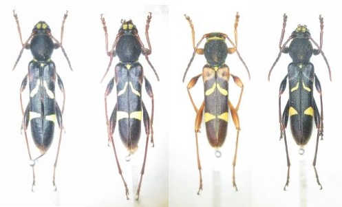 キスジトラカミキリ(Cyrtoclytus caproides )♂ 大分県湯布院町塚原 7.ⅵ.2024(左2頭);右2頭は愛媛県瓶ヶ森林道産キスジトラ♂(左)と屋久島安房産クロキスジトラ(C. kamakarii )♂(右)