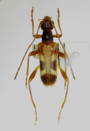 写真左の個体は、表記採集データが示す個体であるが、ご覧の通り上翅の褪色が著しい個体で、突発的な異常個体かと思ったら、同時採集した個体の中にもう一頭同様の個体が混じっていたので、もしかしたら特定地域における特異な個体群、もしくはごく稀に普遍的に出現する特異な色彩変異個体なのかもしれない。