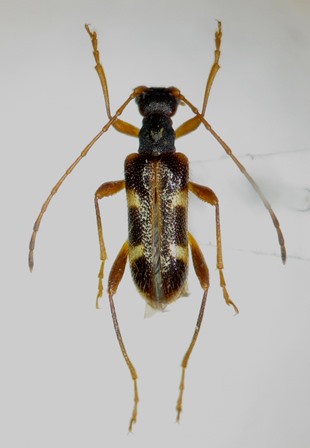 フタオビヒメハナカミキリ(Pidonia puziloi)♂ 栃木県日光市光徳 alt.1,400m 6. ⅶ. 1980どこにでもいて、しかもたくさんいる。そんなピドニアの代表選手の一つが、今回取り上げたフタオビヒメハナ(フタオビチビハナ/フタオビノミハナ)であろう。身近な山で日陰のガマズミの花を掬えば簡単にお目にかかることが出来るが、私が初めて本種に遭遇したのは、高知県梶が森のコクサギの花からであった。今を去ること○○年、懐かしき中学生時代のGW期間中の採集行であったが、全く目立たない、しかも独特の香りを発するこの黄緑色の花に集まる本種の習性に、初遭遇ながらも驚いたものである。