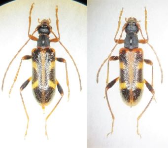 左:アワヒメハナカミキリ(Pidonia ogasawarai)♀ 徳島県木沢村高城山 alt.1,350m 20.ⅵ.1998右:フタオビヒメハナカミキリ(Pidonia puziloi)♀ 徳島県山川町高越山 alt.1,100m 17.ⅵ.1995