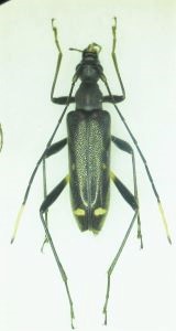 ヤマトヒメハナカミキリ(Pidonia yamato)♀ 宮崎県白岩山 4.ⅵ.2022(写真左)先のキクスイモドキカミキリ九州亜種と同日・同場所での採集品。むろんTさんの手によるもので、嘗てssp.higeshiroとして記載されたこともある九州産の、今回は著しく黒化の進んだ個体。その記載文で新亜種の決め手とされていたのは、♂個体は差異が認められないものの、♀個体のアンテナが白いことと、斑紋が本州産とは若干異なる、というもの。ご承知の通り、その後四国でヒゲシロタイプが通常個体と混在する事実が判明し、併せて斑紋の地域差異はピドニア界では普遍的にみられる点をも鑑み、あえなくこの新亜種名は世に認知されることなく今日に至っている。が、こうした極端な個体を実見すると、やはり九州産は他の地域とは特化の度合いが異なるんだなぁ・・・との印象を感じないわけにはいかない(さすがに本州や四国産で、ここまで黒化の進んだ個体は見たことがありません)。