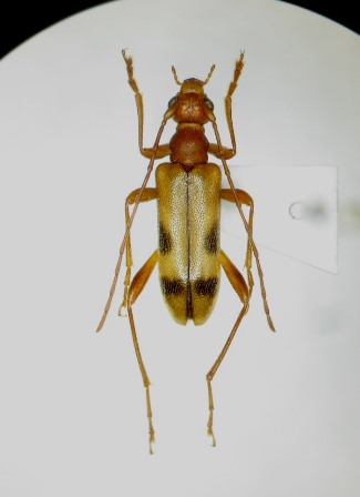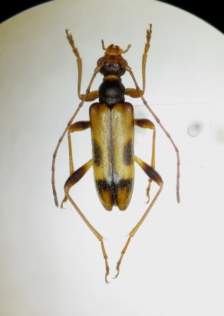 オヤマヒメハナカミキリ(Pidonia oyamae)♂ 長野県茅野市八ヶ岳夏沢鉱泉(alt.2,150m) 15. ⅶ. 2005 ナナカマド花上一般的にオヤマヒメハナの♂は下写真(長野県八千穂高原産)のような個体を見る機会がほとんどであるが、何故か八ヶ岳山塊の一角では高頻度で上写真のような体全体が暗化した個体に遭遇することが出来る。前胸背が黒々としているだけでなく、よく見ると身体全体にわたり暗色化の傾向が著しい。