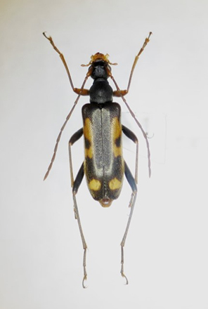 シラネヒメハナカミキリ(Pidonia obscurior obscurior?)♀ 栃木県那須郡那須町茶臼岳峠の茶屋 alt.1,460m 12. ⅶ. 2013 ヤマブキショウマ花上写真左は上記データによる那須山塊産で、実は少し変わった個体となっている。半観半虫で訪れた当日、私自身彼らを観察しながら、どうにも腑に落ちない変な感覚を持ちつつ現地を後にしたのだが、帰宅後よくよく調べてみると、どうやらここのシラネヒメハナ♀については、脚の色が脱色(黄褐色化)する傾向が強いことに気付いた。
